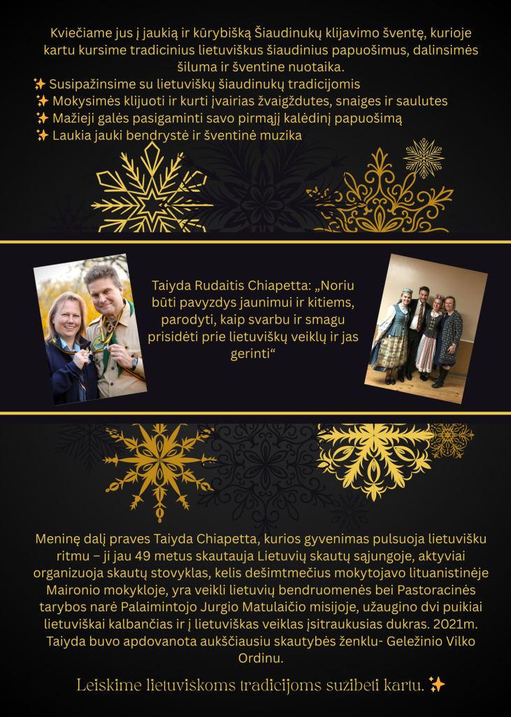 ✨ 2:00pm EST Šiaudinukų lipdymas su menininke Taiyda Chiapetta – kūrybinės dirbtuvės, kuriose kiekvienas galės pasigaminti savąjį šventinį stebuklą.